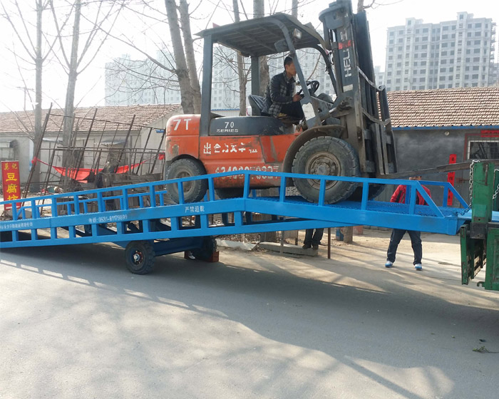 移動(dòng)登車橋是與叉車配合使用的貨物裝卸輔助設(shè)備。有了它,叉車能直接從地面駛?cè)肫囓噹麅?nèi)部進(jìn)行批量裝卸作業(yè)。移動(dòng)登車橋采用人工液壓動(dòng)力,不需接動(dòng)力電源,只需單人操作,可實(shí)現(xiàn)貨物的快速裝卸。它可使企業(yè)減少大量勞動(dòng)力,成倍提高裝卸作業(yè)效率,加快貨物流通速度,獲取更大經(jīng)濟(jì)效益。移動(dòng)登車橋用于郵政、工廠等有站臺(tái)的倉庫、貨廠等大噸位批量裝車,具有效率高等特點(diǎn)。DCQ型為手搖變幅式,用手搖泵操作,不用電源就可使橋板實(shí)現(xiàn)變幅;廣泛用于無裝卸設(shè)備和裝卸貨臺(tái)的流動(dòng)裝卸場(chǎng)所;是一種省時(shí)、省地、解決高位差作業(yè)的高效物流機(jī)械。